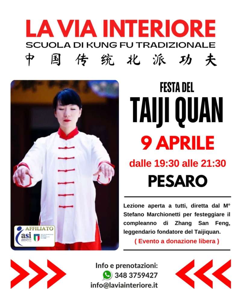 Se vuoi sperimentare la pratica di questa meravigliosa disciplina, questo appuntamento speciale, aperto a tutti, è l'occasione giusta. Ci vediamo mercoledì 9 Aprile alle ore 19:30 presso la Scuola di Arti Marziali LA VIA INTERIORE a Pesaro.